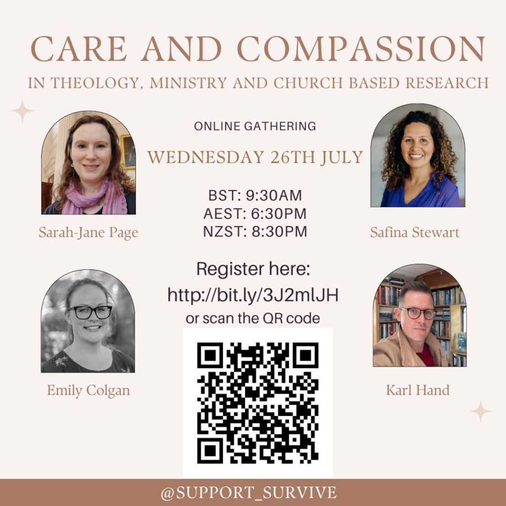 Join us on July 26th as we discuss ideas and strategies for practicing care and compassion (for ourselves and others) as we do ministry, theology and various forms of social research with church communities.